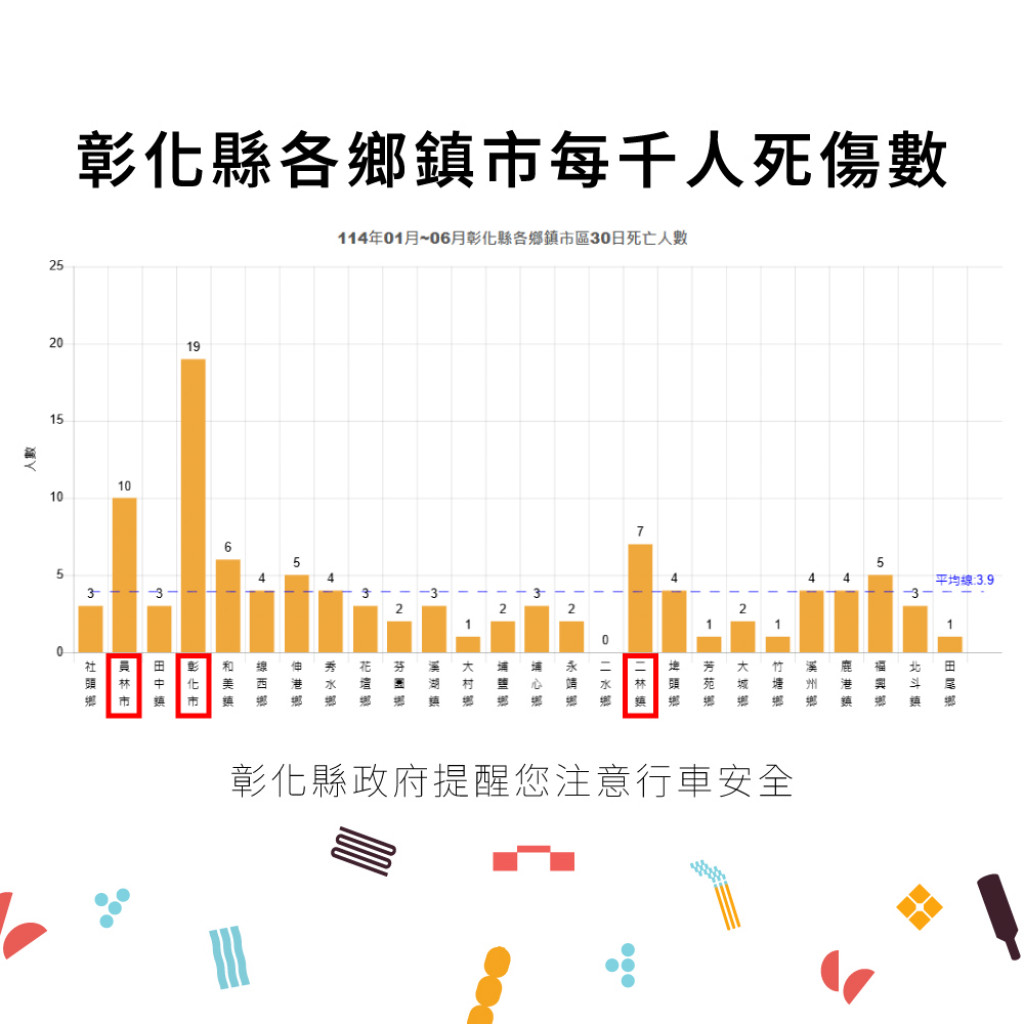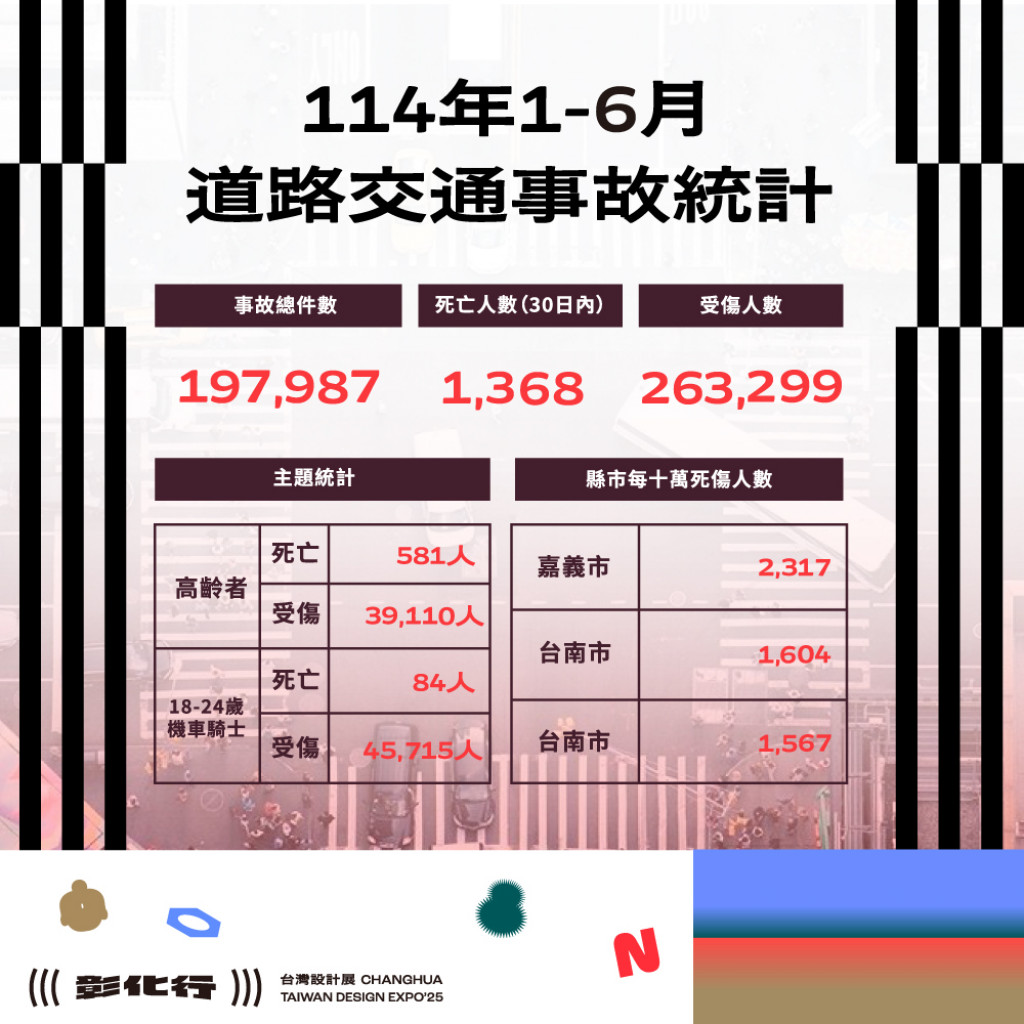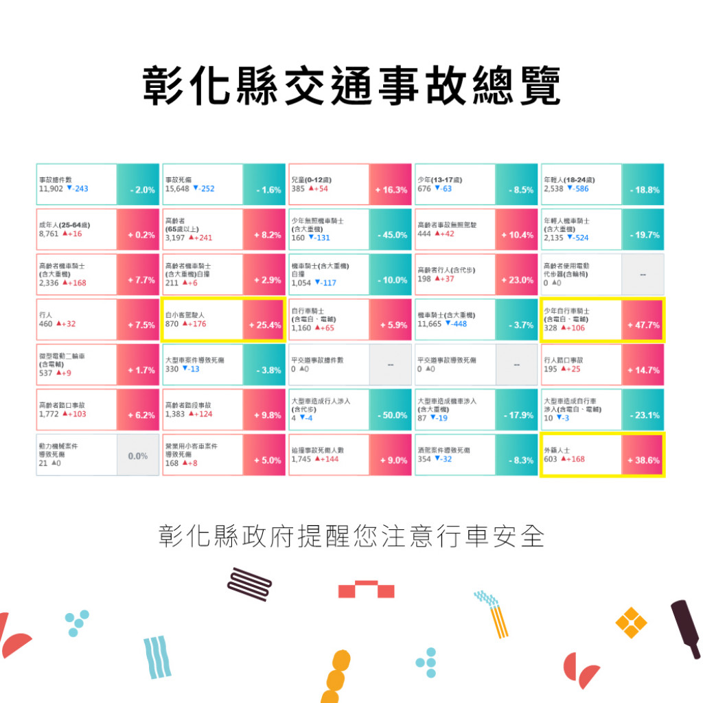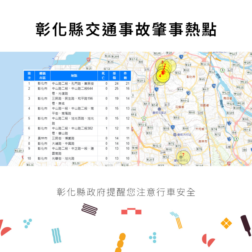 二、根據交通部道安資訊查詢網統計快覽數據跟112年同期比較 分析,以少年自行車騎士(含電自、電輔) 事故增加47.7% 最高,外籍人士事故增加38.6%次之,自小客車駕駛人增加 25.4%再次之。1-6月份30日鄉鎮市每千人死傷人數於「彰 化市、員林市、二林鎮」為多,肇事熱點 以「彰化市」為 多