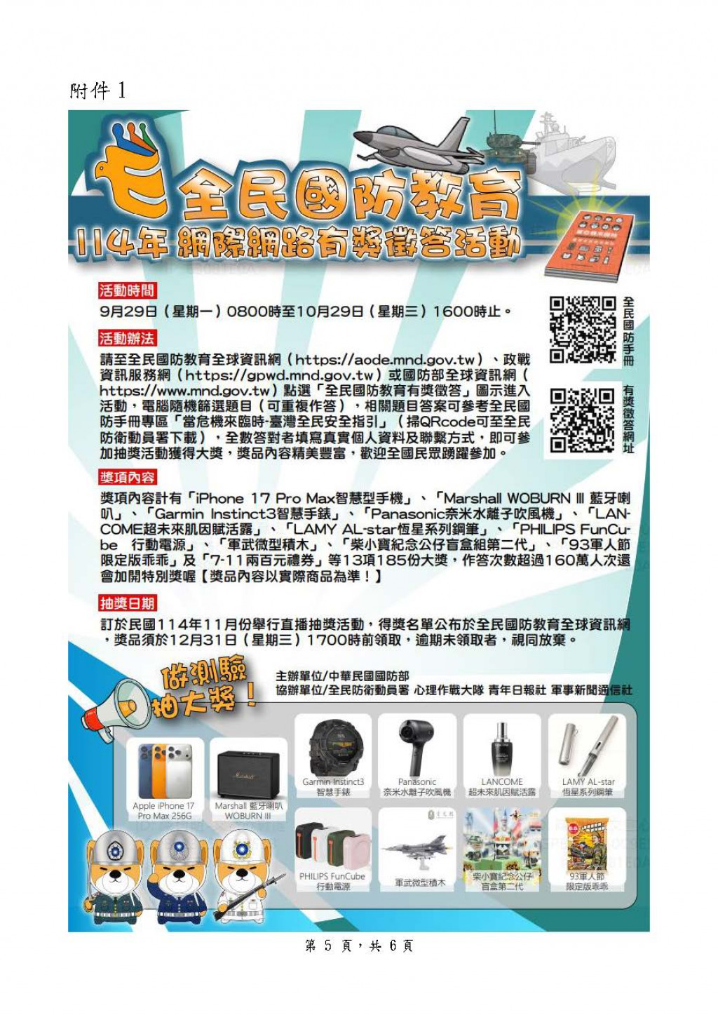 三、活動期程自9月29日上午8時至10月29日下午4時止,相關資訊已上傳全民國防教育全球資訊網,另檢附海報1張,請貴校鼓勵同仁及學生踴躍參加。
