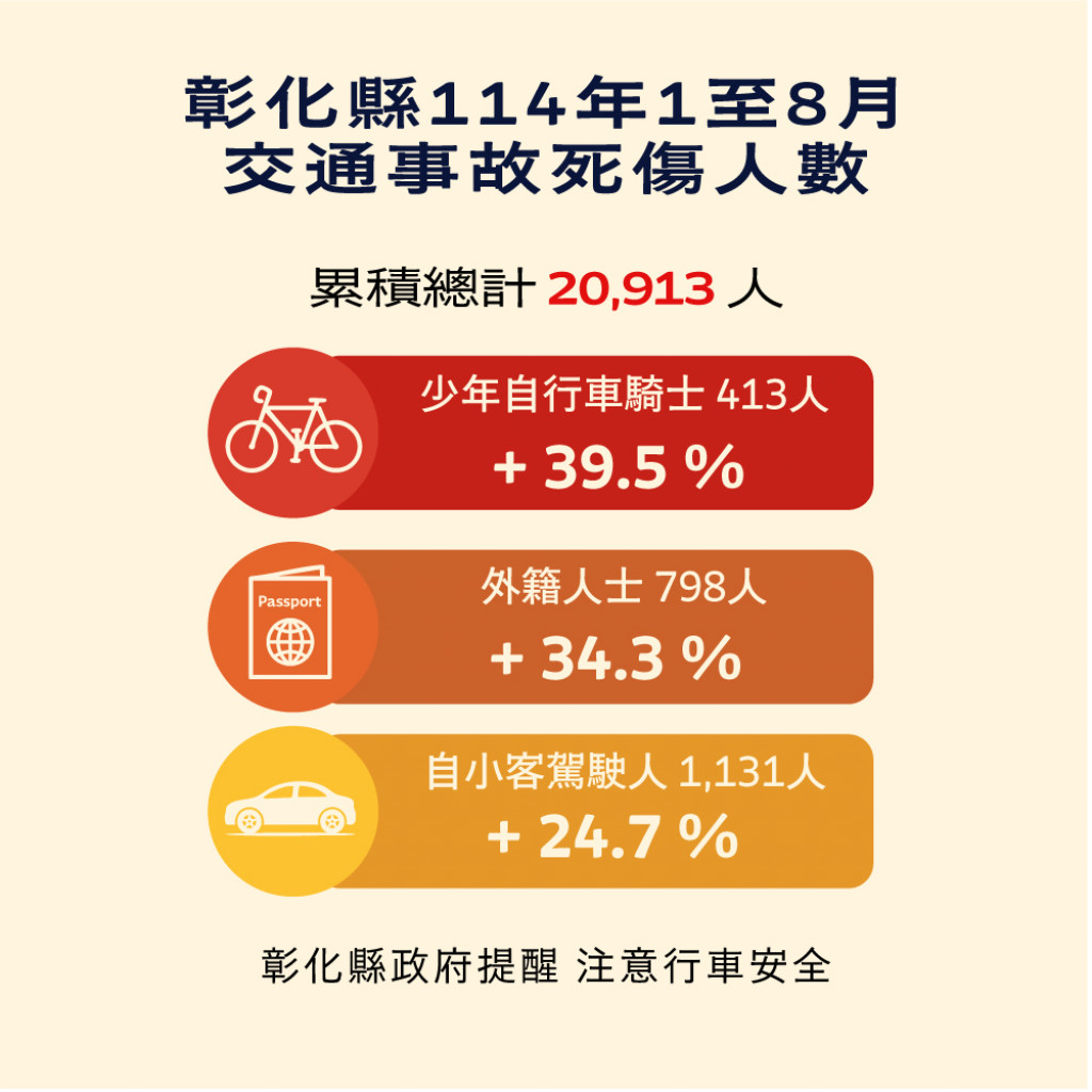 ※※附件為「114年1-8月全國道路交通事故統計、彰化縣交通 事故死傷人數增加排行、本縣各鄉鎮市30日死亡人數、肇 事熱點及交通事故肇因統計
