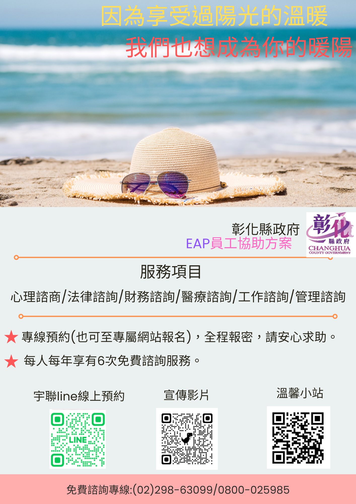 轉知:為營造友善職場環境並促進同仁身心健康,本府員工協助方案(EAP)提供多元專業諮詢服務,請查照並轉知所屬同仁。